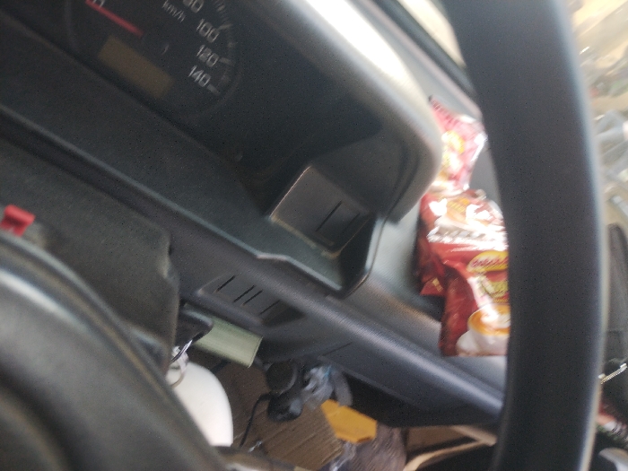 The scene depicts the interior of a vehicle, located in Fagge C, Nigeria, viewed from the driver's perspective looking forward. A dark-colored steering wheel rim occupies the right and bottom-left portions of the frame. The dashboard, primarily dark grey, shows a speedometer on the upper left, marked in kilometers per hour with visible increments for 80, 100, 120, and 140; the needle rests at or near zero. Below this, a rectangular digital display is partially visible. On the passenger side of the dashboard or an adjacent storage area, at least two red and orange plastic bags, consistent with packaged snacks (one bag partially legible as "CHEAP" and "Crunchies"), are present. Beneath the central dashboard, horizontal slats, possibly air vents or storage slots, are visible. The lower section of the image, representing the floor or footwell area, contains miscellaneous items including a white cylindrical object, black wires, and scattered brown and yellow debris. No individuals are present, and no specific actions or interactions are occurring.