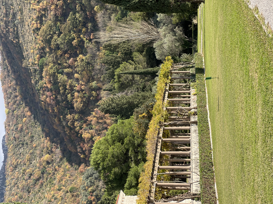 The image captures an expansive garden scene situated in Pržno, Montenegro. In the immediate foreground, a meticulously mown green lawn occupies the lower half of the frame. A small, green, stake-like object is positioned centrally within the lawn. A neatly trimmed, dark green hedge runs horizontally across the mid-ground, bordering a light-colored stone wall that forms the base of a pergola structure. The pergola, extending from the left margin to the right, features numerous evenly spaced, light-colored stone columns supporting a horizontal trellis system. Deciduous vines with predominantly yellow-green foliage are trained over this trellis, forming a canopy. A segment of a light-colored stone building with a tiled roof is visible behind the left portion of the pergola. Behind the pergola and further into the mid-ground, a variety of trees are present, including tall, slender cypress-like trees, broader evergreens, and several deciduous trees, some with bare branches and others with sparse foliage. The background is dominated by a steep, densely forested hillside. The hillside's vegetation comprises a mix of evergreen trees and numerous deciduous trees displaying autumnal colors, primarily shades of orange, yellow, and brown. Thin power lines are visible traversing the upper left section of the hillside. The scene is illuminated by natural daylight. No individuals or animals are present.