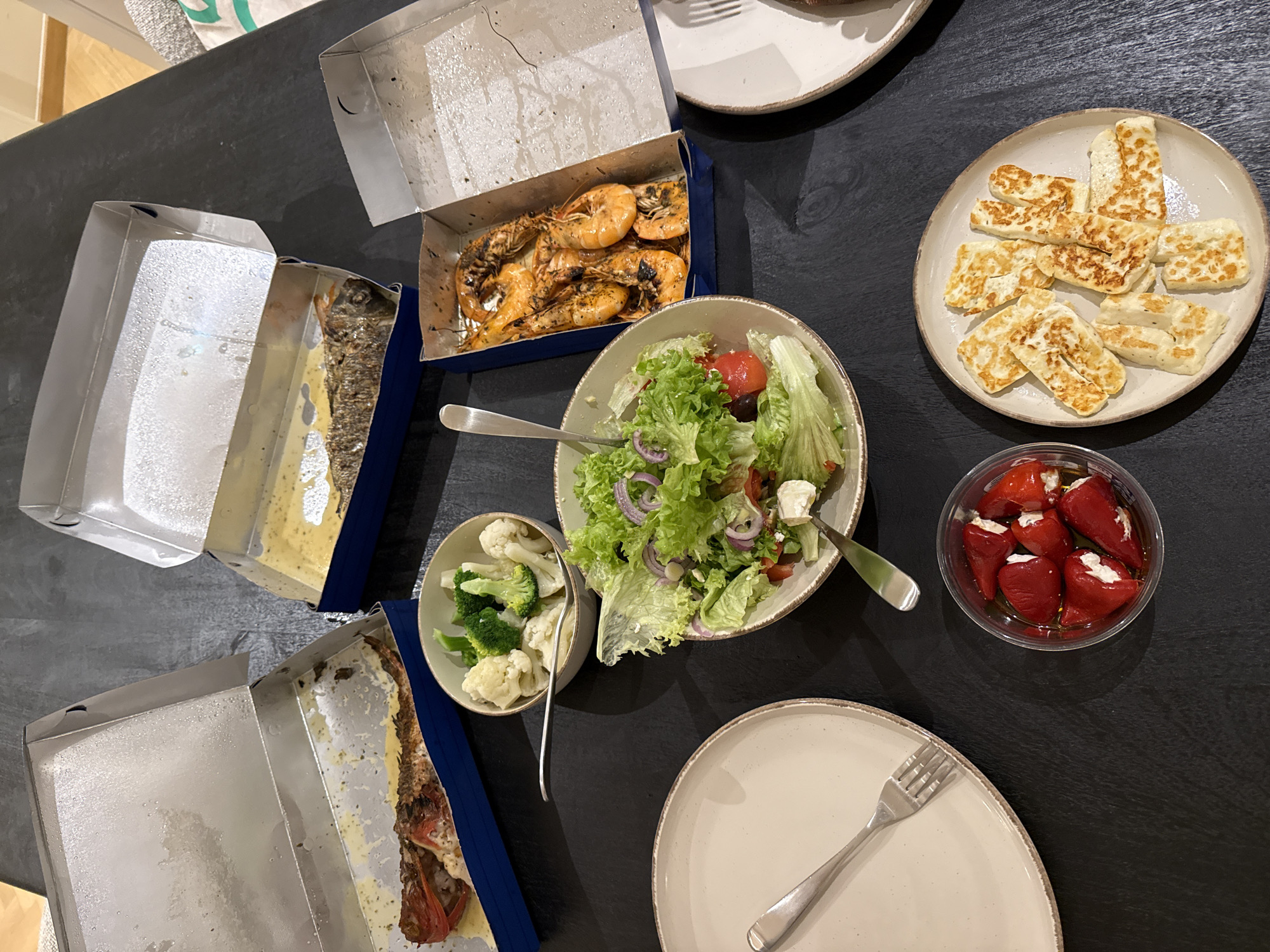A top-down shot reveals a table laden with a meal, likely in a residence in the Municipal Unit of Elliniko, Greece. Several dishes are arranged: one takeout box containing grilled shrimp, another with fish, a plate of fried halloumi cheese, a salad with greens, red onion, and tomatoes, a small bowl of cooked broccoli and cauliflower, and a clear container of small, red peppers stuffed with a white filling. Plates and forks are also visible, set for dining. The takeout boxes suggest the meal was likely brought in, not prepared on-site.