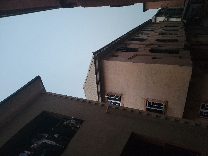 An upward-angled perspective captures the exterior of a tall, multi-story building with a light brown facade. Various windows punctuate the walls. The sky above is pale. Nearby, a roofed structure shows exposed contents through an opening. Dark structural elements frame the upper and lower edges of the scene, creating a confined view of the architecture.