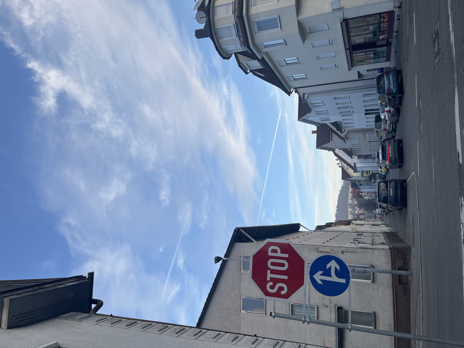The photo captures a street scene with buildings lining both sides. A stop sign and a directional sign are visible on a pole. Cars are parked along the street. The sky is predominantly blue, filled with wispy clouds. A jet contrail cuts across the upper portion of the sky. The angle of the shot looks upwards, accentuating the height of the buildings.