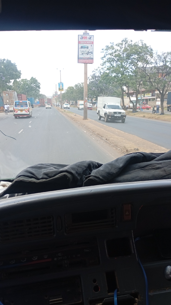 A view from inside a vehicle, likely a truck, reveals a straight road ahead. Various vehicles populate the road, including a white delivery truck and a police van with visible markings. A tall billboard advertising truck parts stands roadside. Trees line the street, creating a slightly urban yet nature-integrated scene. The dashboard of the vehicle is in view, with a jacket or clothing item resting on top.