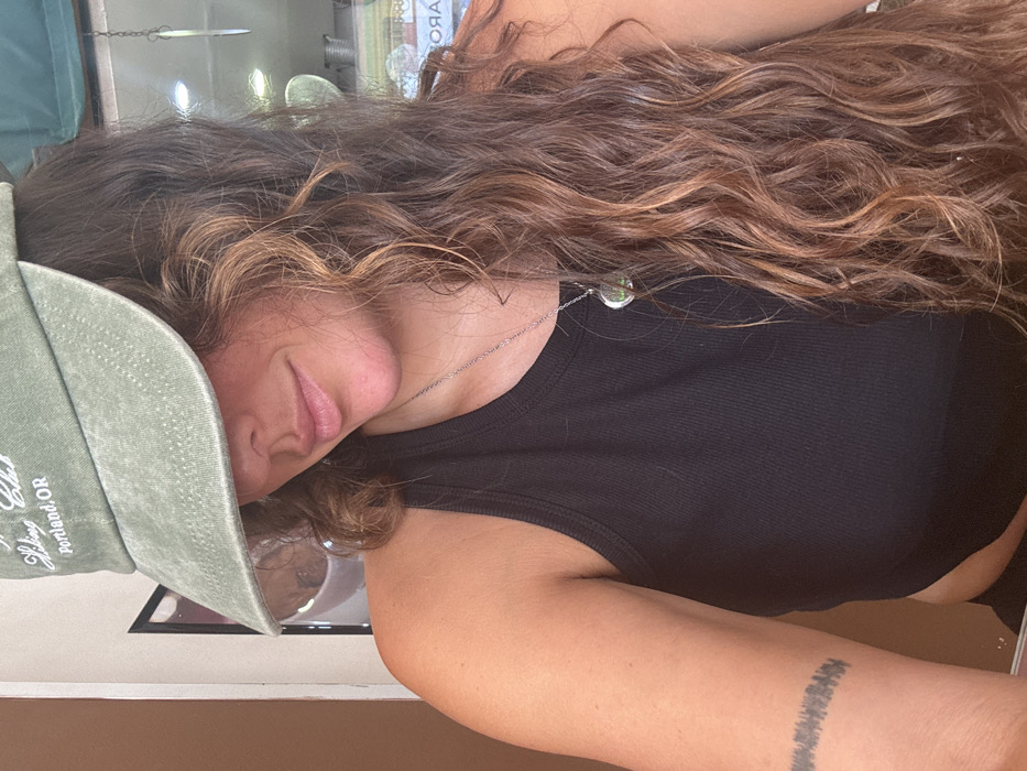 A female individual is partially depicted from the upper chest upwards within an indoor setting in Thong Sala, Thailand. She wears a faded olive green baseball cap with "Spring Club" and "Portland, OR" embroidered in white, with the brim obscuring her eyes. Her long, wavy brown hair, featuring lighter highlights, cascades over her shoulders and chest. She is dressed in a black ribbed tank top. A thin silver chain necklace with a circular pendant, possibly green, is visible. On her left upper arm, a horizontal, abstract tattoo resembling a waveform is present. Her lips are pink and display a slight upturned curve, suggesting a smile. The immediate background to her left is a plain brown wall. To her right, an open area or window reveals a brighter, semi-outdoor environment with a green awning, several metallic buckets or planters, and shelves displaying items, one with partial lettering visible. A slender, metallic hanging ornament is visible in the upper right background. The overall environment appears to be a casual establishment like a cafe or shop.