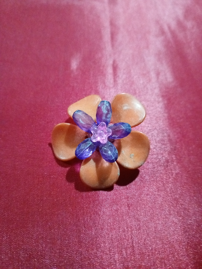 - "The image displays an artificial, multi-layered flower-shaped object centrally positioned on a red, textured fabric surface" by FM-jp5zv1, licensed under CC BY 4.0