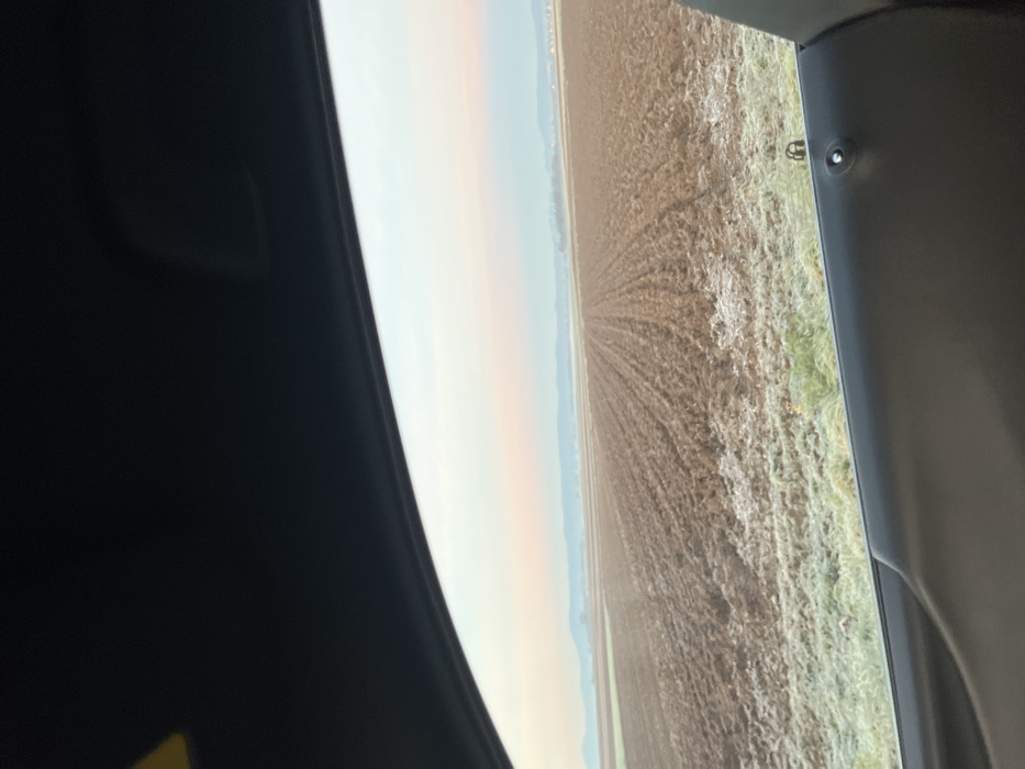 A landscape of plowed fields stretches to the horizon, viewed from inside a vehicle