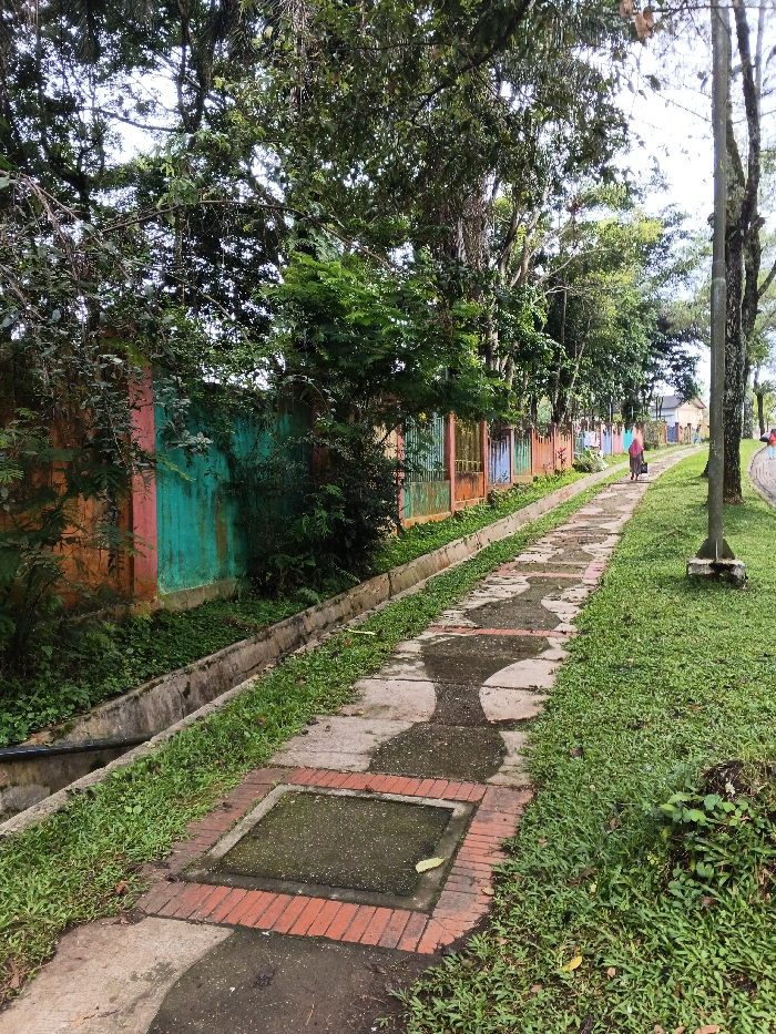 The image depicts an outdoor pedestrian pathway in Unknown, Vietnam. The pathway, constructed of concrete with integrated red brick sections, shows damp patches. To the left, a narrow concrete drainage ditch runs parallel to the path, bordering a low wall. This wall displays alternating painted sections of orange and teal-green, featuring integrated multi-colored metal fencing. Dense green foliage and tree branches extend over the wall from behind. To the right of the pathway, a grassy area is visible, lined by mature trees with lush green canopies. A dark gray street lamp post stands upright on the right side of the path. In the middle-ground, an individual, dressed in a pink or red top and dark lower garment, walks away from the camera along the path. A light-colored building with a dark roof is visible in the far background, partially obscured by trees.
