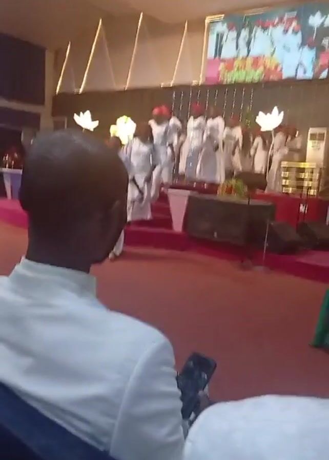 Here’s a description of the video: The video shows an interior view of a church. A man wearing a white suit is seated in the foreground, looking at his phone and glancing toward the stage. On the stage, a choir of women wearing white and red outfits are performing. A large screen behind the choir displays a zoomed-in view of their performance. The church interior is well-lit with red carpeting and simple decorations.