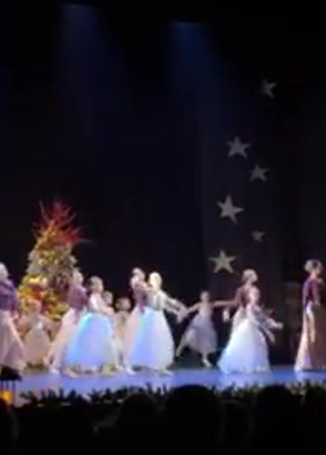 A group of dancers is performing on a stage. Most of the dancers are wearing white dresses, while some are wearing maroon tops with white skirts. They are performing a ballet routine. In the center of the stage, there is a decorated Christmas tree. The backdrop is black with white star decorations. There are red curtains on either side of the stage. The audience can be seen in the foreground.
