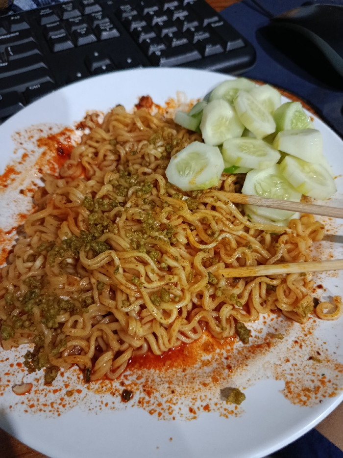 This image, taken in Kedung Dowo, Indonesia, displays a close-up, high-angle view of a white plate containing a meal. The central focus is a portion of cooked instant noodles, thoroughly coated in a red, chili-based sauce and heavily garnished with a green, granular seasoning. To the upper right of the noodles, a cluster of thinly sliced cucumbers is present. A pair of light-colored wooden chopsticks extends from the right edge of the frame, with one end resting within the noodles. In the blurred background, a black computer keyboard is visible to the upper left, and a black computer mouse is partially visible to the upper right, resting on a dark surface. No individuals are depicted.