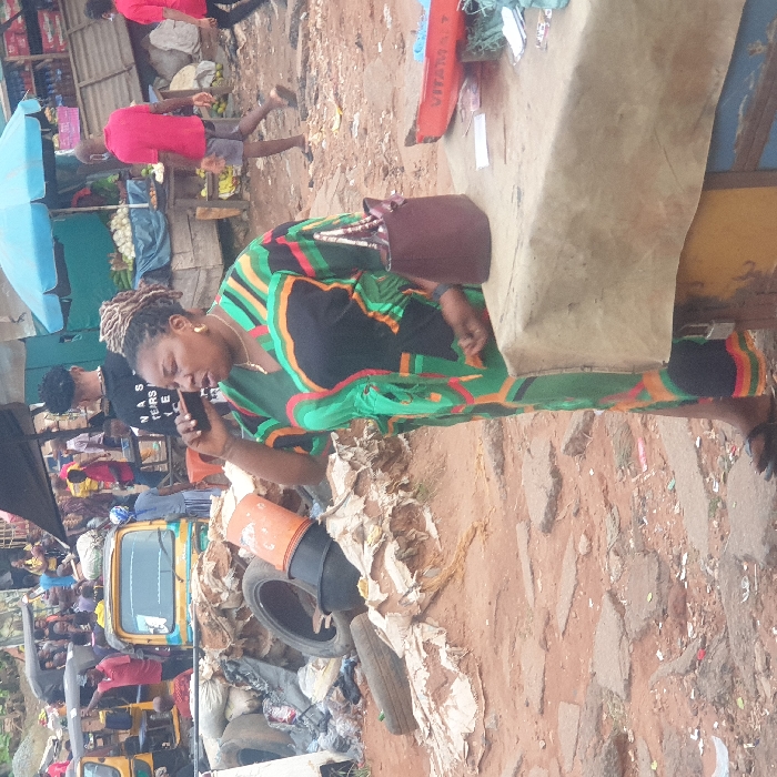 - "A woman in a green and black patterned dress and a brown bag sits on a table in a busy outdoor market, talking on a cell phone" by FM-5FaYX2, licensed under CC BY 4.0