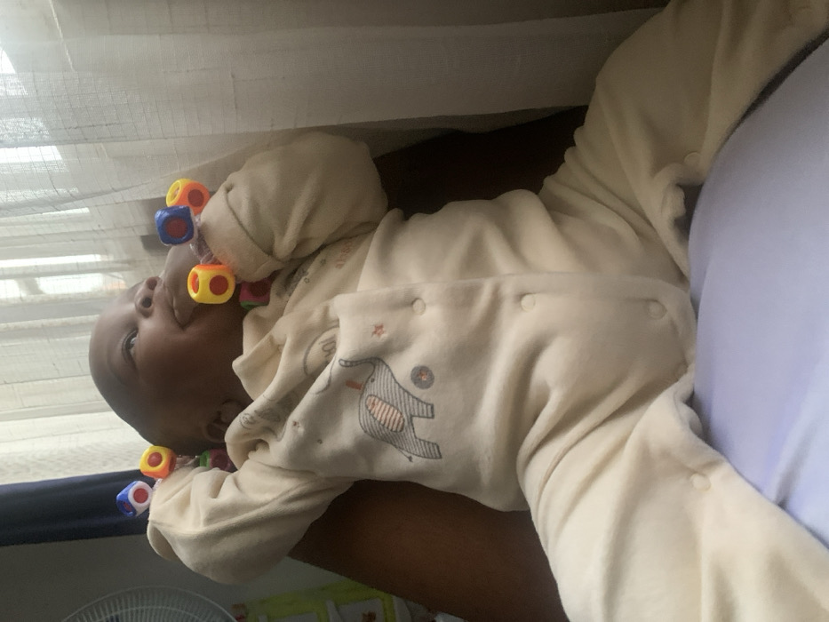 - "A baby wearing a light beige onesie with an elephant design is lying down, possibly in someone's lap" by FM-AE2Hv2, licensed under CC BY 4.0