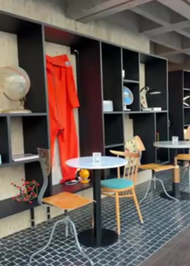room with a unique design. There are small round tables with chairs arranged next to a wall that's covered in what looks like a black and beige shelving unit. Various items are placed within the shelves including a globe, books, a model of molecules, and a bright orange jumpsuit hanging from a rod. The floor is covered in black and white checkered tiles. The ceiling has a pattern of intersecting concrete beams. No people are visible in the video.