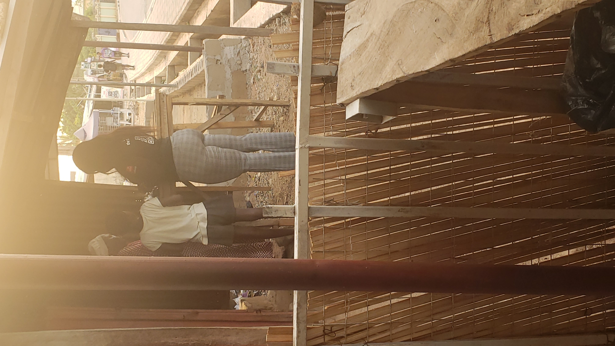 The image depicts an outdoor scene in Narayi, Nigeria, under strong, low-angle sunlight. In the immediate foreground, a rustic barrier is visible, composed of vertical metal posts, horizontal bars, and diagonally arranged wooden slats. A thick, dark reddish-brown pipe or post is positioned on the left. On the right, a rough-hewn wooden plank forms a counter-like surface, with a black plastic bag placed underneath. Behind this barrier, three individuals are partially obscured but discernible. A person with long dark hair, wearing a black long-sleeved shirt with white text and light-colored plaid pants, stands with their back mostly to the camera, facing left. To their left, a younger individual, possibly a child, wears a white t-shirt and dark shorts, also facing left. Further left and partially obscured by the foreground pipe, another individual in a patterned garment and light-colored head covering is present. These three appear to be gathered around a wooden structure or table. The ground in the midground is uneven dirt, consistent with a construction site or undeveloped area, featuring loose concrete blocks and wooden framing. In the background, a paved road with a concrete curb and drainage ditch is visible on the right. Two pedestrians are walking away from the camera on the road. Along the street, multiple makeshift stalls, one with a prominent purple canopy, are present, alongside utility poles and distant vegetation beneath a bright sky.