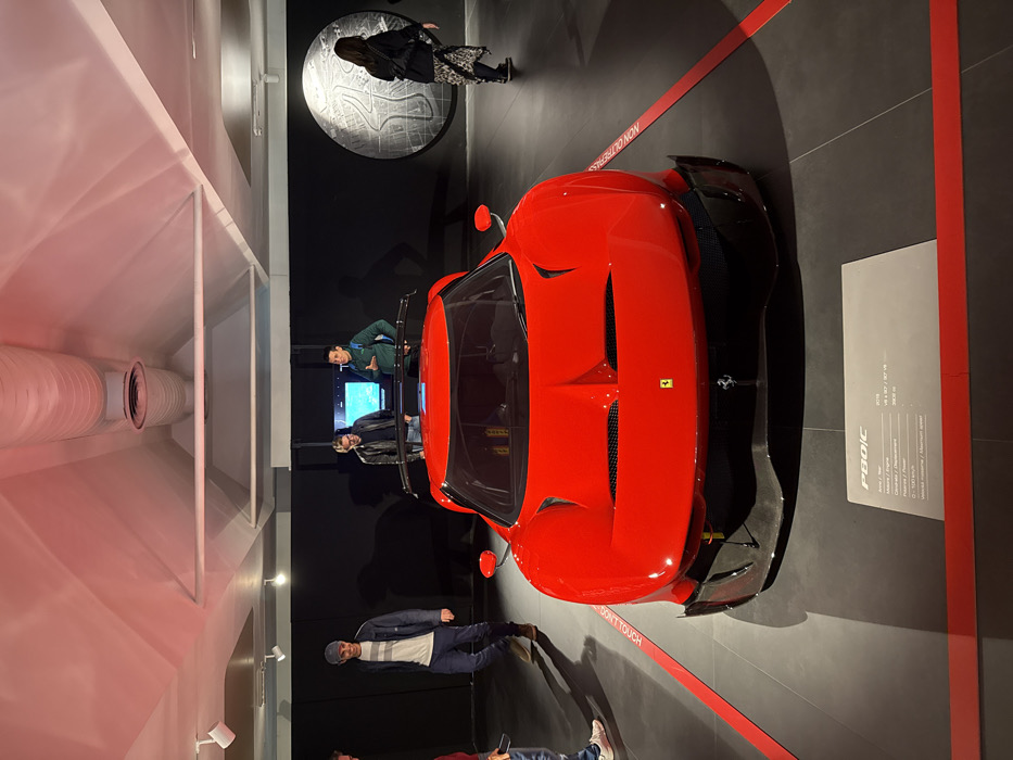 The image depicts the interior of the Ferrari Museum in Maranello, Italy