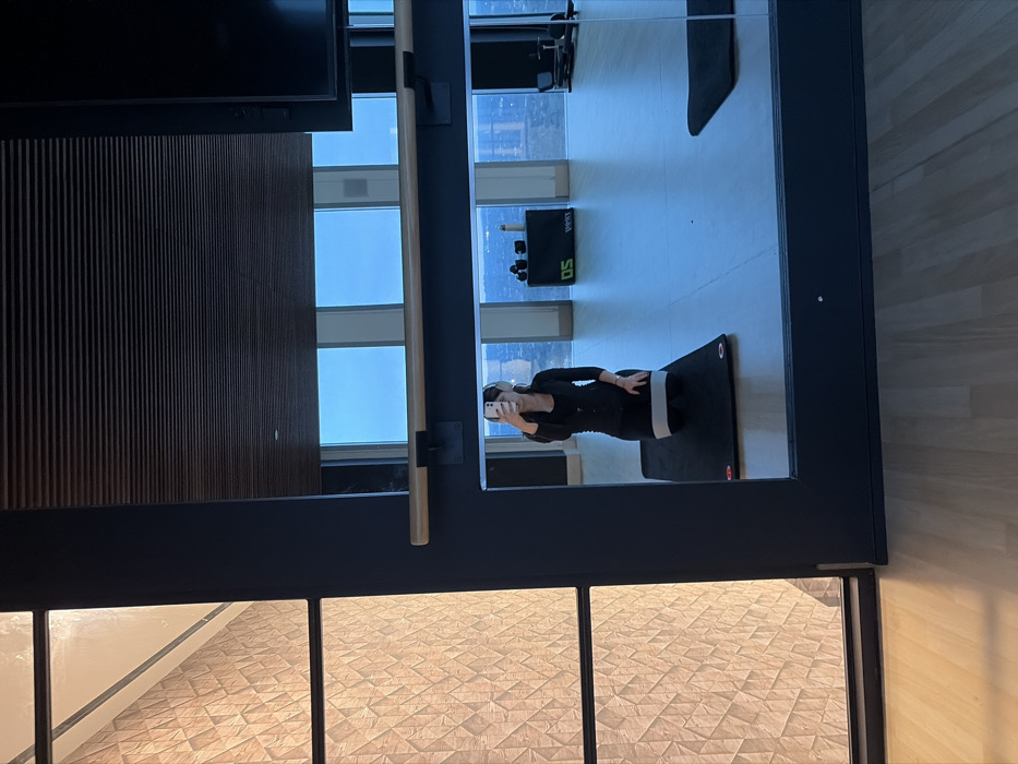 A person takes a selfie in a mirror, reflecting a gym. The mirror shows a fitness mat, a weight box, and exercise equipment against a backdrop of high-rise buildings through windows. The person is wearing black attire and a resistance band. The mirror frame is dark, with a view of a room featuring beige, geometric-patterned flooring below.