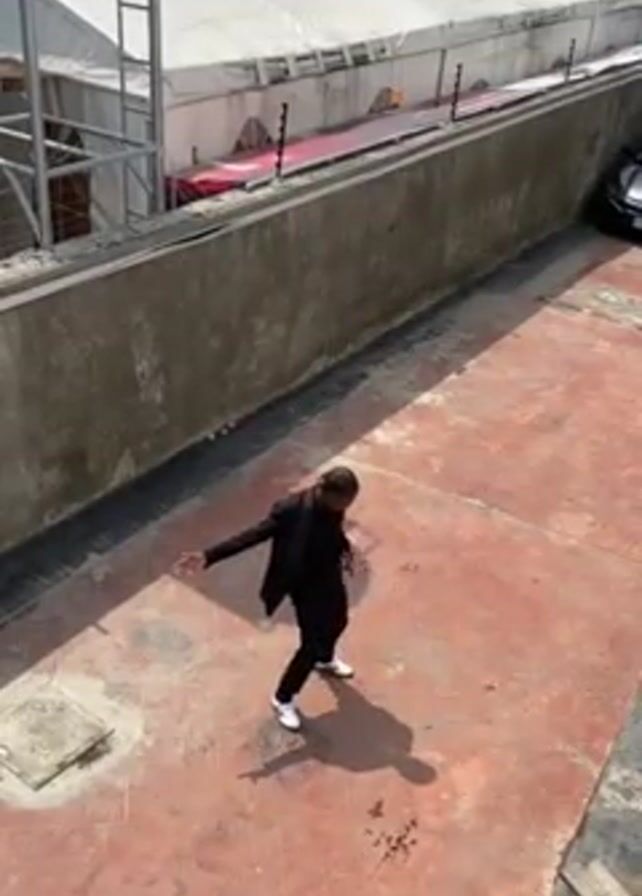 A man wearing a black suit and white shoes dances on a rooftop in broad daylight