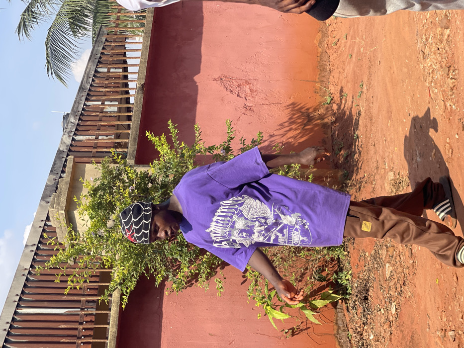 The image depicts an outdoor scene in Neni, Nigeria, under bright, clear daylight. The primary subject is a dark-skinned male, estimated to be between 18 and 25 years old, captured mid-stride, walking from left to right. He wears a black knitted beanie with a white spiderweb pattern and a red central motif, an oversized purple short-sleeved t-shirt featuring a prominent white graphic print of winged figures and text, brown track pants with a yellow rectangular patch on the upper left thigh, and black Adidas slide sandals with white stripes. His head is slightly lowered, and his gaze is directed to his right. To the subject's left, a vibrant green shrub grows against a faded reddish-orange plastered wall. Above this wall, a horizontal section of a rusty-brown corrugated metal fence or structure is visible, suggesting a building or further enclosure. The sky overhead is a clear light blue with minimal cloud cover. In the upper right background, a single palm tree frond is visible. On the far right edge of the frame, the lower torso, right arm, and hand of a second individual are partially visible, wearing light-colored trousers and a white garment, standing adjacent to the primary subject. The ground is composed of reddish-brown dirt or earth, with sparse small green plants. Direct sunlight casts clear shadows, notably from the primary subject onto the ground to his right.