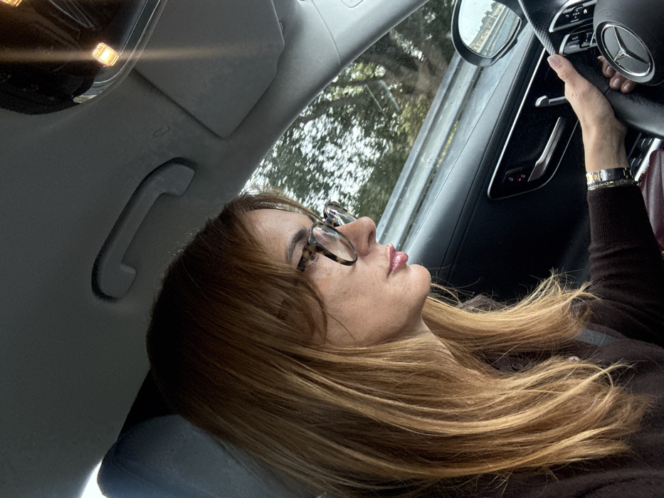 A female subject, appearing to be an adult, is depicted in profile from the chest up, seated in the driver's position of a vehicle