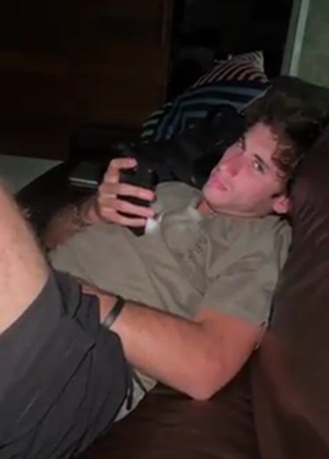 A young man is lying on a dark brown leather couch, facing the camera. He's wearing a light green t-shirt, dark shorts, and a silver chain. He is holding a black smartphone in his hands and appears to be looking at it. There is a black bag and a patterned pillow behind him. The environment is dimly lit, and part of a dark wood cabinet is visible in the background.