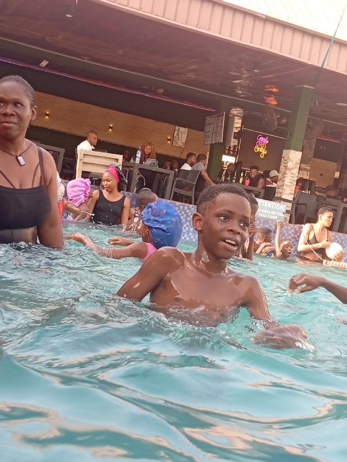 A water pool is filled with people, some immersed to their chests. A young, dark-skinned boy with short hair is at the forefront, looking to the right. Other children are nearby, one with a blue swim cap. In the background, adults sit at tables under a covered area with signage. There is an overall golden hue, as if the photo was taken during late afternoon.