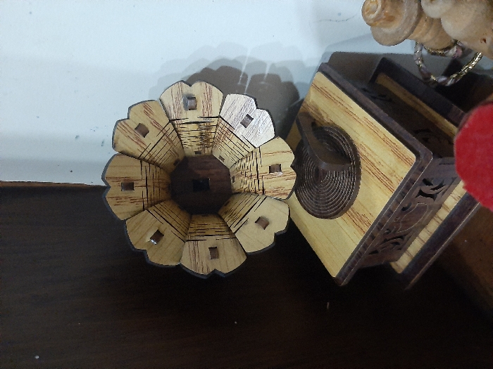 An indoor scene displays a decorative wooden gramophone replica. The central object consists of a light-colored wooden horn shaped like a multi-petaled flower, featuring etched linear patterns and small dark square inlays on each segment, with a dark wooden center. This horn is mounted on a rectangular wooden base. The base has a light-colored wooden top surface, upon which rests a dark wooden circular element with concentric grooves, resembling a record, and an attached arm. The sides of the base are made of darker wood, intricately carved with decorative patterns. The background on the left consists of a dark brown, vertical surface, possibly wood, while the background on the right is an off-white wall with minor blemishes. In the lower right foreground, partially visible objects include a segment of a light-colored wooden carving, a reflective item, and a red fabric object. No individuals are present, and no actions or interactions are depicted. This scene is located in the city of Barza Municipality, Syria.