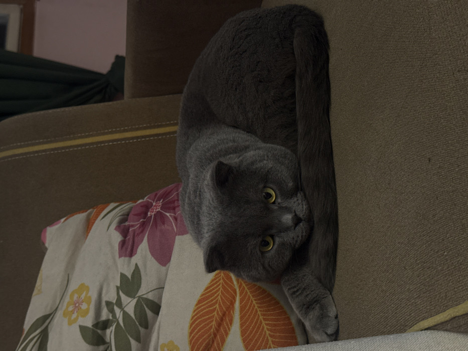 - "A domestic grey Scottish Fold cat is observed lying on a brown upholstered sofa in an indoor setting" by FM-6icqR2, licensed under CC BY 4.0
