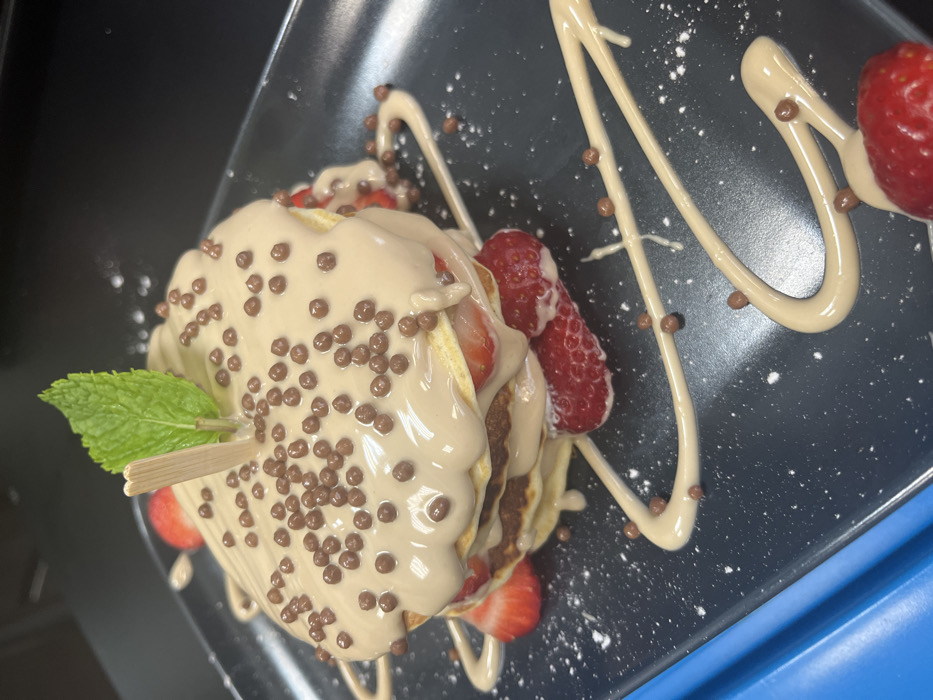 A stack of three golden-brown pancakes rests centrally on a rectangular, dark gray or black plate with white speckles. The pancakes are generously covered with a thick, light beige, viscous sauce, evenly distributed across the top and sides, dripping slightly onto the plate. Numerous small, spherical, dark brown chocolate crispies are scattered over the sauce. A fresh green mint leaf, held upright by two short, light-colored wooden picks, garnishes the peak of the pancake stack. Sliced fresh strawberries are visible between the pancake layers and at the base, with a prominent red strawberry half positioned at the lower right corner of the stack. The same light beige sauce is drizzled in wavy patterns across the plate, accompanied by additional chocolate crispies and light white dust, likely powdered sugar. The background is dark and out of focus, suggesting an indoor setting such as a cafe or restaurant. A partial, out-of-focus blue object is visible in the lower left corner. While the scene depicts a prepared dessert consistent with a food service establishment, there are no discernible visual identifiers within the image itself to specify a precise location within the city of Burgas, Bulgaria.