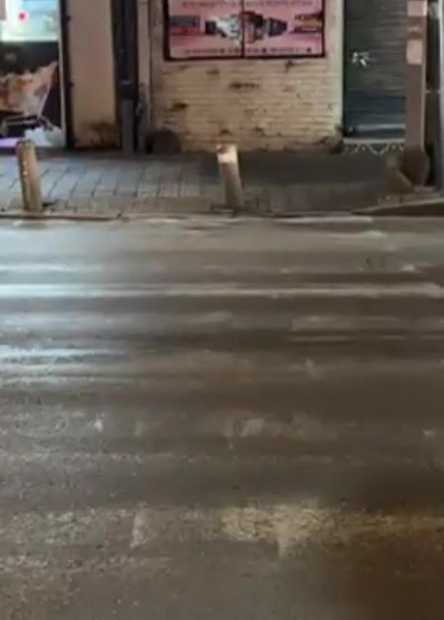 street scene at night. The road is wet and reflects the streetlights. Buildings line the side of the road, one with a storefront visible. A bicycle rides across the crosswalk.