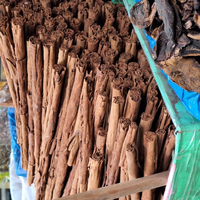 A large bundle of cinnamon sticks dominates the scene, displaying a range of light to dark brown hues. The sticks are densely packed, their rolled edges facing upwards. To the right, a smaller pile of dark, dried goods is visible, contrasting with the cinnamon's lighter tones. Blue and green plastic wrap provides a backdrop, partially obscuring other items. Wooden supports are subtly present, adding a textural element to the composition.