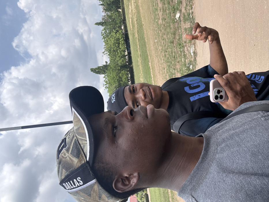 two African males standing outdoors in Ihiagwa, Nigeria, under a partly cloudy sky. The male in the foreground, positioned on the left, wears a grey t-shirt and a camouflage-patterned baseball cap with "DALLAS" written on the side and a prominent "D" on the front; his head is turned slightly to the right, looking forward. The second male, situated behind and to the right of the first, wears a black t-shirt with blue lettering, a black baseball cap featuring a white logo, and is looking directly at the camera with a smile. He holds a light pink smartphone, equipped with a triple-lens camera module, in his left hand, while his right hand is raised with fingers slightly curled. A dark, vertical pole is partially visible in the upper center-left background. The environment behind the individuals consists of a wide, open area with dry, brownish-green grass, bordered by a dense line of green trees. Further in the background, additional taller trees and a dark-colored vehicle are discernible. The immediate ground beneath the subjects appears to be an unpaved surface.
