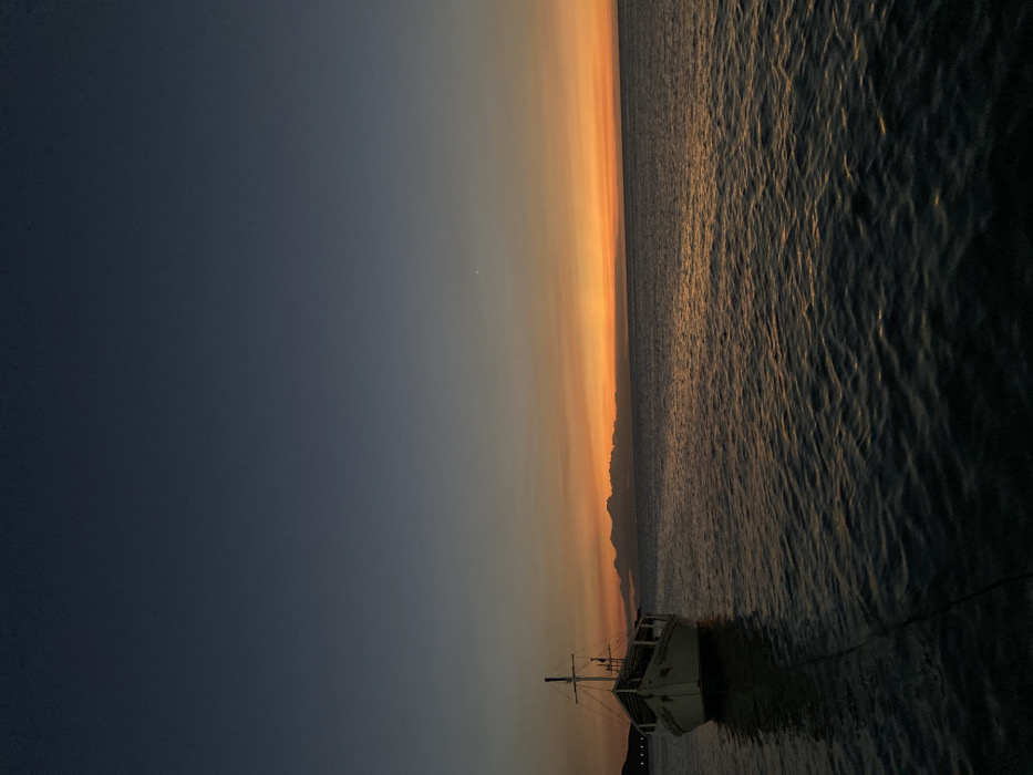 The image depicts a coastal scene in Juan Griego, Venezuela, during twilight or sunset. A light-colored vessel, approximately 10-12 meters in length, with a single mast and visible rigging, is moored in the left foreground, facing towards the right. A dark line, consistent with a mooring rope, extends from the vessel's bow into the dark water towards the lower-left corner. The water exhibits subtle ripples, reflecting the ambient light. The horizon line is visible, separating the water from the sky. Along the horizon, a low, dark landmass or cloud formation is discernible, extending from the left towards the center. The sky presents a distinct gradient, transitioning from dark indigo at the zenith to vibrant orange and deep red hues just above the horizon. A single, distinct light point, possibly a star or planet, is visible in the upper-middle right quadrant of the sky. No individuals are present in the frame.