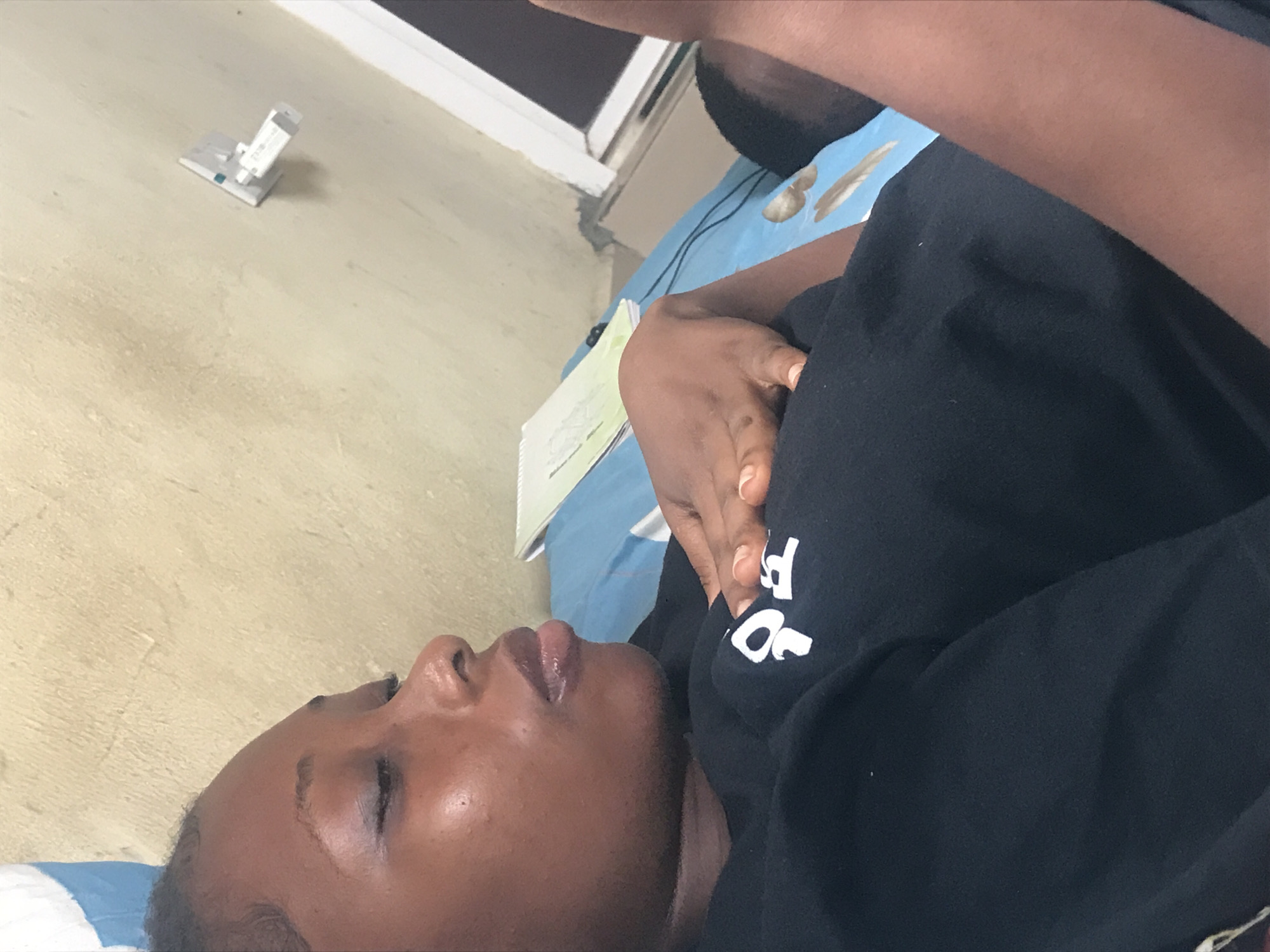 An individual with a dark skin tone is depicted lying on their left side, facing slightly upward with their eyes closed or heavily lidded. They wear a black short-sleeved top featuring partially visible white lettering on the chest. Their right hand rests on their mid-chest area. The individual is positioned on a bed covered by a light blue sheet with a subtle pattern. A light-colored, spiral-bound notebook is visible on the blue sheet behind the person's head. The background consists of a textured, light beige wall. An electrical outlet with a white device, possibly a charger, plugged in and emitting a small blue light, is affixed to the wall. A dark cable or wire is visible on the blue sheet. A dark vertical frame, potentially a window or door, is partially visible in the far right background. The scene is an indoor residential setting, in Uyo, Nigeria.