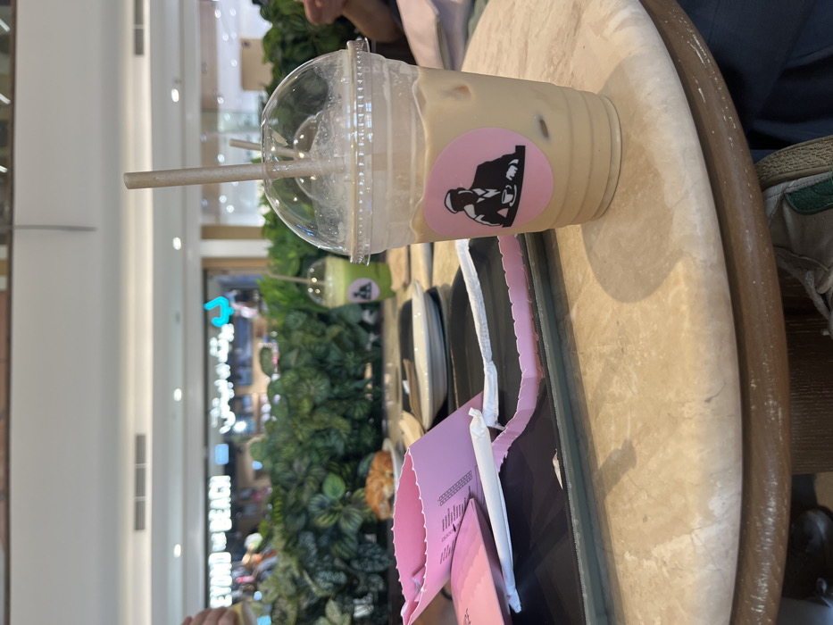 - "An overhead shot shows a partially consumed iced coffee with a pink logo on a round table" by FM-leUqa2, licensed under CC BY 4.0