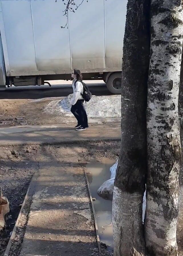 A young person wearing a backpack and a white jacket walks along a muddy sidewalk next to a street with a large white truck parked on the side. Patches of snow remain on the ground. Three birch trees stand in the foreground, partially obscuring the view. Further down the street, a person walks in the opposite direction. A two-story building is visible in the background. The sky is clear and blue.