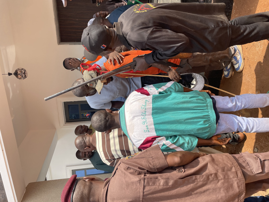 A group of people stand together, some holding what appears to be a long gun or rifle. One man wears a bright orange shirt, while another has a teal and white jacket with text on the back. Several people wear hats, and a man in the foreground wears a brown uniform with a red hat. The scene appears to be outdoors near a building with white walls.