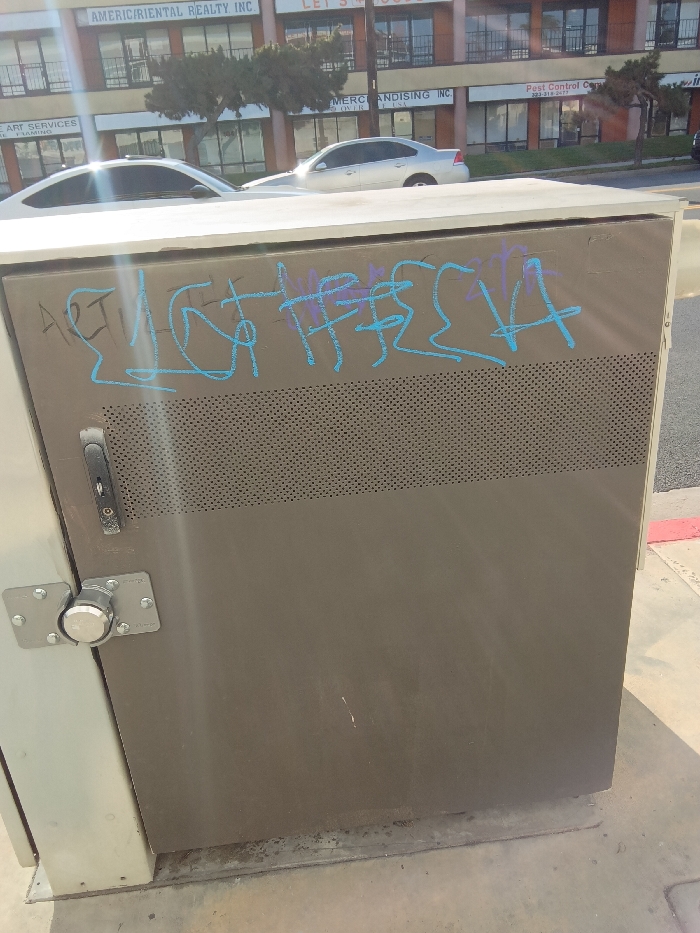 The image depicts a drab brownish-gray utility box situated on a concrete sidewalk on a brightly lit day. The utility box features graffiti on its upper front panel, including an illegible tag rendered in light blue spray paint with some purple accents, and the word "ART" in black spray paint on the far left. Below the graffiti, a horizontal band of small circular perforations spans the width of the box. On the left side of the front panel, there is a black vertical handle and latch assembly, and lower down, a silver cylindrical lock mechanism secured to a metal plate. The base of the box shows some staining on the concrete. In the background, across a street, a two-story commercial building is visible. Its ground floor houses several businesses with large glass storefronts, identifiable signs include "AMERICAN/ORIENTAL REALTY INC.", "MERCANDISING INC.", and "Pest Control Center" with the phone number "626-318-6888". The upper floor features balconies with dark railings. Small, manicured trees are planted in front of the building. Two cars are visible on the street: a white car on the left exhibiting strong sun glare, and a silver sedan partially visible to its right. A red curb line is present on the right side of the sidewalk. No individuals are visible in the scene. The location is on the sidewalk outside 320 W Garvey Ave, Monterey Park, California, United States of America.