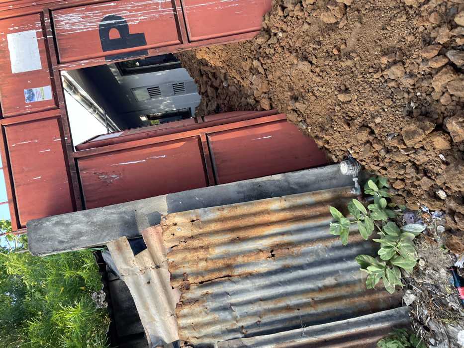 The scene depicts an outdoor environment in Dar es Salaam, Tanzania, characterized by an improvised boundary and disturbed earth. On the left, a vertical fence constructed from several corrugated metal sheets, heavily rusted and discolored, stands adjacent to a grey concrete pillar. At the base of this fence, sparse green foliage and scattered debris, including plastic items, are visible. A white water meter with a blue cap is positioned on the ground, connected to a pipe that enters the reddish-brown soil. To the right, a barrier or gateway is formed by stacked, dark red metal panels, likely repurposed industrial materials. These panels exhibit white drip marks and general weathering. An angled opening between these panels reveals a substantial accumulation of reddish-brown, clumpy earth, forming an uneven mound or path. Beyond this earth, a light-colored building with a dark roof overhang is visible, featuring a partially visible barred window and a door. Large, black capital letters, specifically "P", are painted on the right-hand red panel of the opening. A small, faded sticker or poster is affixed to the upper left red panel. The sky overhead is bright and clear. No people or direct human activity are observable within the frame.