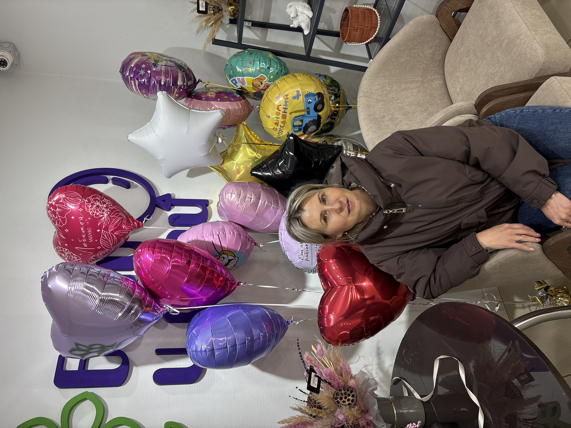 A woman is reclining on a beige armchair surrounded by numerous foil balloons of various shapes, sizes, and colors. She is wearing a brown jacket and blue jeans. The balloons include heart-shaped, star-shaped, and round balloons with cartoon and decorative patterns. The background includes a white wall with large, purple and green decorative elements, a dark metal shelf with a few decorative items, and a vase of dried flowers. The image was likely taken indoors at a business establishment, specifically in the city of Nizhnevartovsk, Russia.