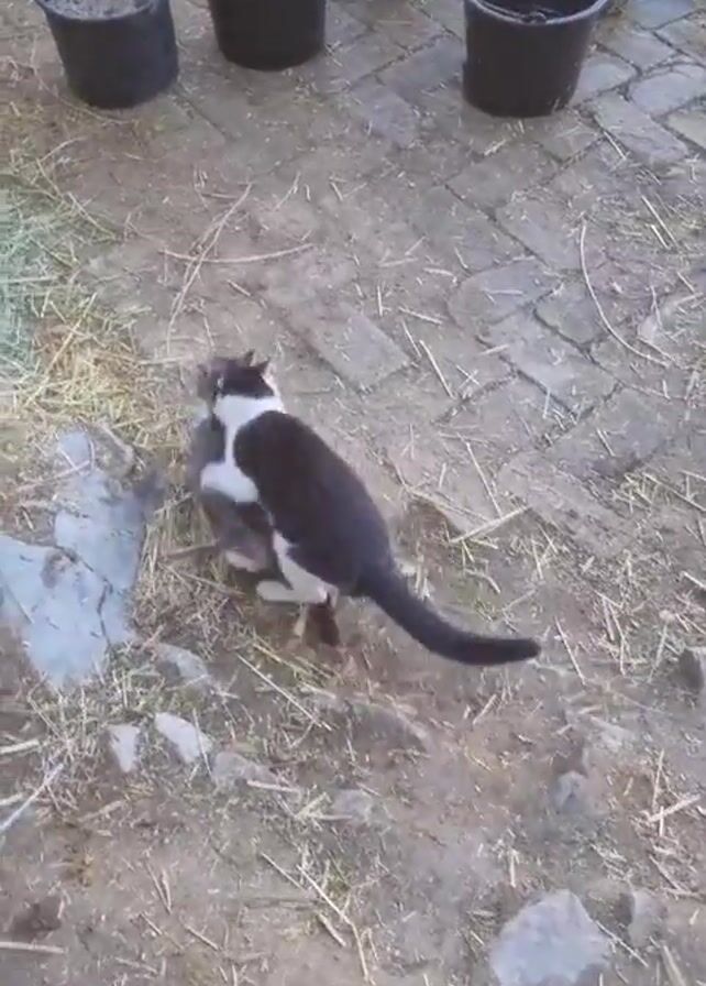 two cats in an outdoor environment. One is black and white, and the other is grey striped. The cats are grappling with each other on the ground. A person's leg wearing a dark-colored boot and pants moves toward the cats. The person makes a "psh" sound, appearing to shoo them away. The cats move away from each other. The surrounding environment includes several black buckets, some filled with a substance, a gray bucket, a white hose, loose hay or straw scattered on the ground, and brick pavers. The setting seems to be a backyard or a similar outdoor space.