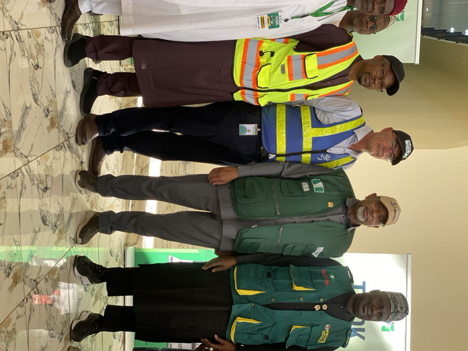 This image displays five adult males standing side-by-side indoors, posing for a photograph. The specific location within Rigachikun, Nigeria, is not discernible from the image, though elements suggest a Nigerian context. From left to right: 1. A male subject is partially visible on the far left, wearing white traditional Nigerian attire, a white cap, and a green lanyard with an identification badge. 2. A dark-skinned male wears a black cap, black-framed glasses, a dark maroon long tunic, and a bright yellow high-visibility vest with reflective silver stripes. He has a short beard. 3. A Caucasian male wears a black cap with "TMDP" text, clear-framed glasses, a light blue collared shirt, dark blue trousers, and a dark blue high-visibility vest featuring yellow reflective stripes and a white stylized emblem on the left chest. An identification badge is clipped to his belt. He wears brown lace-up shoes. 4. A dark-skinned male with a grey beard wears a tan cap with "SMAR3" or similar text, a grey long-sleeved shirt, grey trousers, and a dark green multi-pocket vest. The vest displays a Nigerian flag patch and "NMA" text on the left chest. He wears olive green sneakers. 5. A dark-skinned male wears a dark green patterned cap, a black long tunic, and a dark green multi-pocket vest with yellow accents. Text on the vest includes "FOCUS FIRST" and "PMAS." He wears black sneakers. The subjects are standing on a polished, light-colored tiled floor with irregular brownish-grey patterns. The background is a plain light-colored wall. A green banner with white text and a green abstract logo (partially visible, possibly "TMDX") is positioned behind the central and right figures. The scene is evenly lit by indoor lighting.
