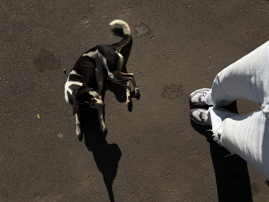 An overhead shot shows a dog with black and white markings lying on dark asphalt. The dog's shadow is prominent beside it. Nearby, a pair of legs clad in light blue jeans and wearing white sneakers are visible. The perspective is from above, looking down at the dog and the person standing next to it.