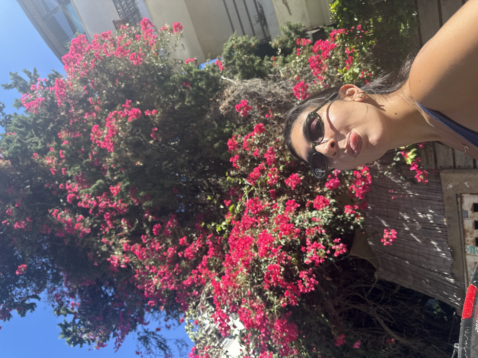 - "An outdoor, vertically oriented daytime image displays a young adult female in the lower right foreground against a backdrop of dense flowering vegetation and urban architecture, consistent with a street or residential area in Tel Aviv, Israel" by FM-r6ou73, licensed under CC BY 4.0