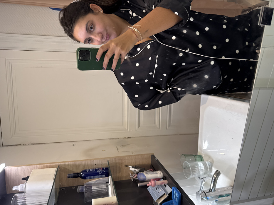 A woman in black and white polka-dot pajamas takes a mirror selfie in a bathroom. The sink and faucet are visible. A partially open drawer reveals toiletries. The woman is holding a green phone, and bracelets adorn her wrist. A door is in the background. The lighting is soft and natural.