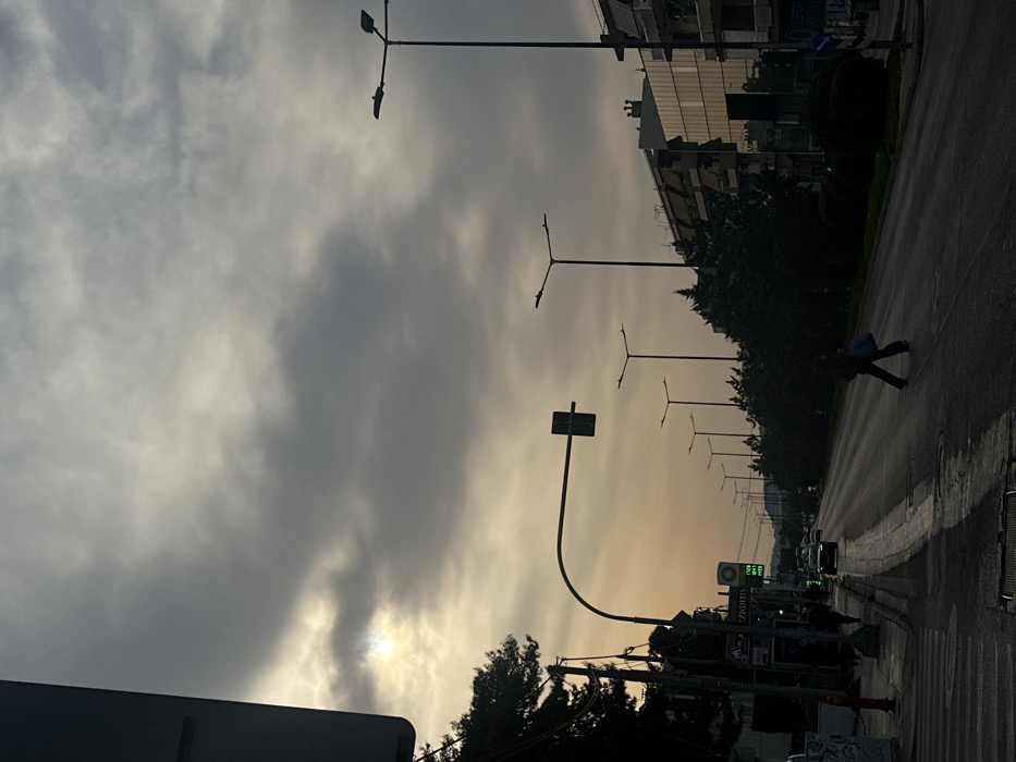 The image depicts a wide urban street scene in Agia Paraskevi, Greece, specifically near the Agios Ioannis area, indicated by signage at a visible BP gas station on the left. The sky is overcast with heavy grey clouds, though a patch of sunlight penetrates through, visible in the upper left, suggesting either early morning or late afternoon. In the foreground, a multi-lane asphalt road extends into the distance. On the left side, a sidewalk is visible, featuring a red fire hydrant and dark green pine trees. A BP gas station stands prominently, displaying its logo and fuel prices (e.g., 1.729, 1.979) along with Greek text including "ΑΓ. ΙΩΑΝΝΗΣ". A large, arched metal pole extends over the road from the left, supporting a dark, rectangular traffic light. Further down the left lane, at least two vehicles are observed. On the right side of the road, a single individual, silhouetted against the ambient light, walks across the street from right to left, carrying a light-colored bag over their shoulder. This individual is positioned outside the immediate area of the foreground crosswalk. Numerous tall streetlights with dual luminaires line the right side of the road, receding into the background. A row of dark evergreen trees and shrubs separates the roadway from multi-story buildings. Some buildings on the right feature reflective glass facades, while others display balconies with dark awnings. The overall scene is characterized by muted colors and strong silhouettes due to the backlight from the partially visible sun.