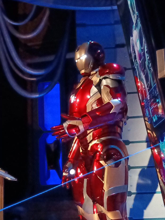 red and gold Iron Man statue, standing in a dark room, likely part of an exhibit. The statue is positioned on a dark background, lit by a blue light. The room appears to have a large, rectangular blue panel on the left side, and a transparent display panel on the right. The statue’s right arm is raised as if in a greeting pose, and it's missing its left arm, which is obscured by its body. The statue is positioned against a backdrop of large, flat, dark, rectangular panels. The statue is likely located in the Disney Studios Park in Chessy, France, near the Walt Disney Studios, based on the given coordinates. The room's dark tones and the statue's pose suggest the statue might be part of a superhero themed exhibit.