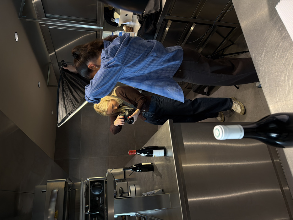 The scene depicts a product photography session in a modern, industrial-style kitchen in Marche-lez-Écaussinnes, Belgium. Two females are engaged in photographing wine bottles. A blonde female, positioned slightly to the left, is holding a black DSLR camera with both hands, aiming it downwards towards the counter. She wears a brown long-sleeved top and dark pants. To her right, a second female with dark hair tied in a high ponytail holds a black rectangular softbox light modifier, directing light towards the subjects. She is dressed in a blue and white checkered long-sleeved shirt and dark pants. On the brushed stainless steel counter in the mid-ground, three dark glass wine bottles are arranged, two with dark foil caps and one with a red foil cap and a white label. In the immediate foreground, a fourth dark glass wine bottle with a white foil cap is partially visible on a lower stainless steel surface. The kitchen features extensive stainless steel countertops, cabinets, and professional appliances, including a large oven-like unit and another machine with a prominent dial. The walls are dark gray, and recessed lighting is visible in the ceiling. A MacBook laptop and a water bottle are present on a distant counter to the right. A black stool or low tripod is partially visible near the feet of the female holding the softbox.
