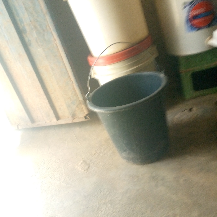 The image depicts an indoor or semi-enclosed concrete-floored area in Rinjim Gani, Nigeria. In the foreground, slightly to the right of the center, a dark grey or black plastic bucket with a metal handle stands upright on the concrete. In the background, to the right, a stack of light-colored plastic buckets or containers is visible; the bottom one features a red band. Adjacent to these containers, a white container with a circular red label and a green base, possibly a water dispenser, is partially visible. To the left background, a weathered wooden structure, potentially a door or panel with vertical slats, stands upright. A bright light source is present on the left side of the frame, causing overexposure in that area of the concrete floor and the wooden structure. No individuals are present in the scene.
