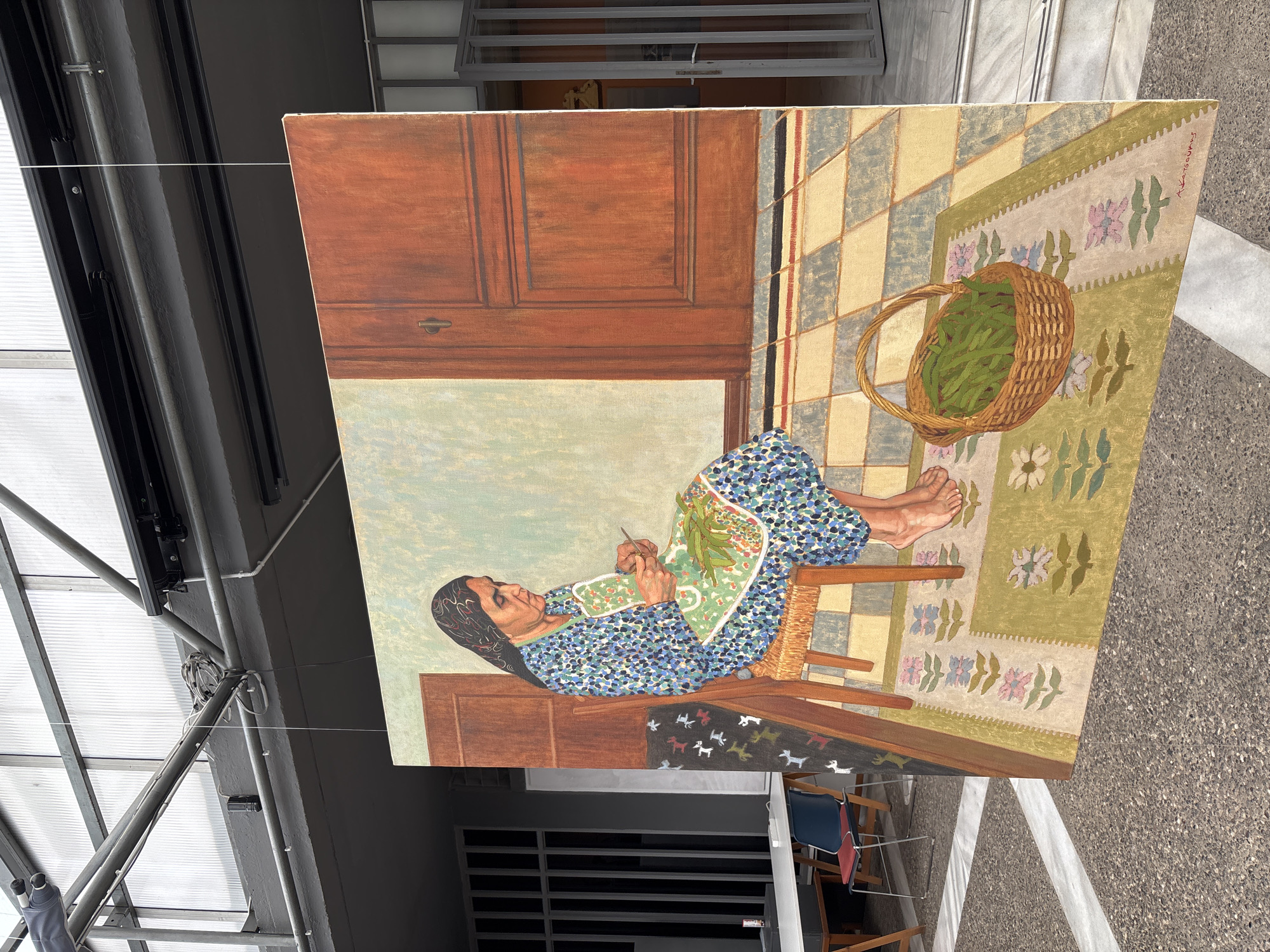 A large, rectangular canvas painting is displayed vertically outdoors in the city of Drama, Greece. The painting is suspended by thin lines from a dark, horizontal track system, which is integrated into a metallic truss structure supporting a translucent roof overhead. The ground beneath is a dark gray speckled aggregate pavement, featuring a prominent, broad light-colored diagonal stripe. The painting depicts an elderly woman seated in a domestic setting. She wears a dark patterned headscarf and a long-sleeved, blue, green, and white patterned dress, and is barefoot. She sits on a simple wooden chair with a woven seat, leaning forward as she uses a small knife in her right hand to prepare green leafy vegetables held in her left hand. A quantity of these vegetables rests on a patterned green and white apron or cloth covering her lap. To the woman's right, on a floral patterned rug, a woven basket filled with green vegetables is present. The rug features pastel-colored floral motifs (pink, blue, white) on a light green background. The floor in the painting is composed of light blue-grey and light yellow-beige checkered tiles, delineated by a narrow red and black striped border. The background within the artwork includes a light blue-green wall to the left and a reddish-brown wooden door with paneling and a visible keyhole on the right. A dark fabric with white animal silhouettes is partially visible to the left of the woman's chair. A signature is present in the lower right corner of the canvas. In the actual environment surrounding the painting, to the left, a smooth light grey wall and a dark, vertically barred window are visible, alongside portions of a white table and two chairs (one blue, one red). To the right of the painting, a light marble step leads to a partially open, grey-framed glass door, offering a glimpse into an interior space.
