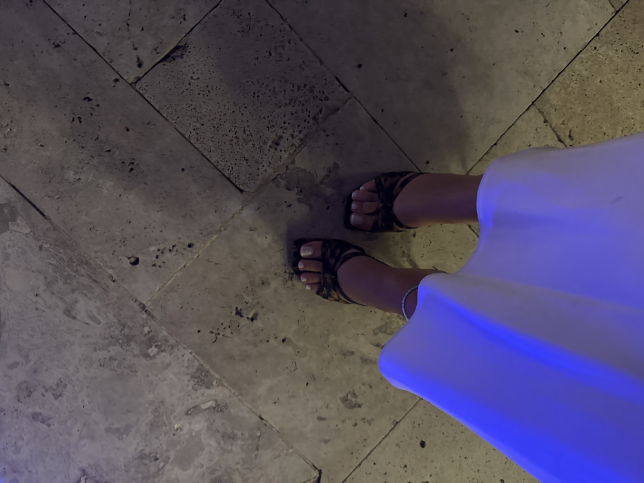 The image displays a downward-facing view of a person's lower legs and feet standing on a paved surface. The individual is wearing open-toed sandals featuring dark, patterned straps, and a light-colored garment, likely a dress or skirt, that extends downwards. A distinct blue light source illuminates the lower left section of the garment. The toes exhibit white nail polish, and a light-colored anklet is visible on the left ankle. The ground consists of large, irregularly shaped stone tiles, varying in shades of grey and beige, showing texture and some pitting. The scene is dimly lit by artificial light. The location is in the city of Rishon LeZion, Israel.