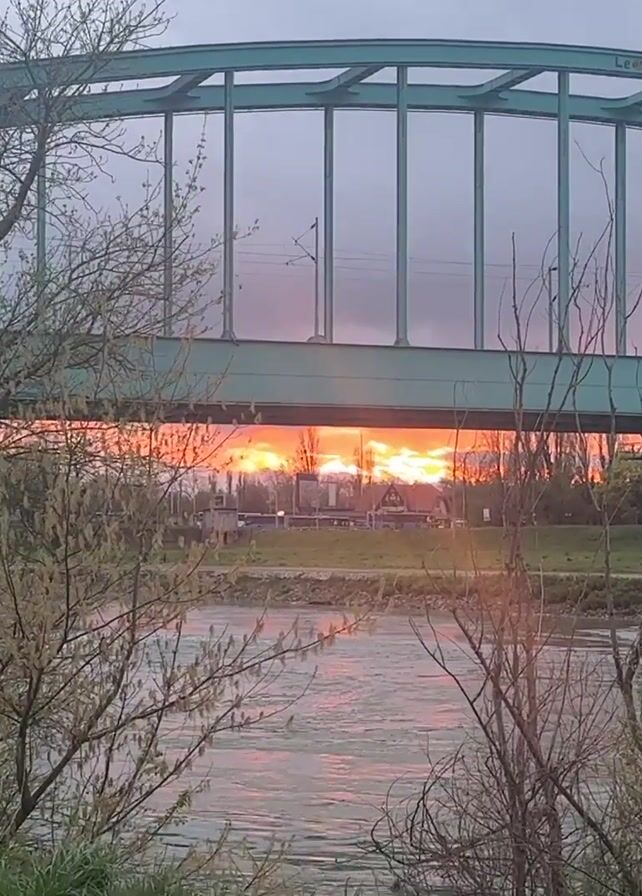 The video opens with a wide shot of a green steel bridge spanning a river. The sky is overcast, but a vibrant orange and yellow sunset shines through the bridge's structure. In the foreground, there's a grassy bank with bare trees and a brown dog. As the camera zooms in, the sunset becomes the central focus, revealing a building with a red roof and "FOOD PUB" written on it, along with several parked blue buses in front.